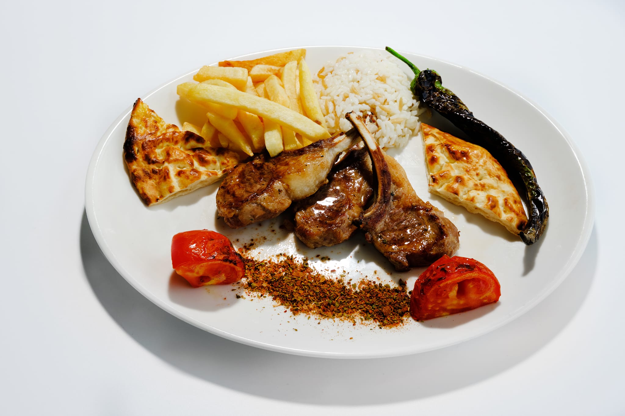 3 Adet Kuzu Pirzola, Pilav, Domates, Biber, Cips